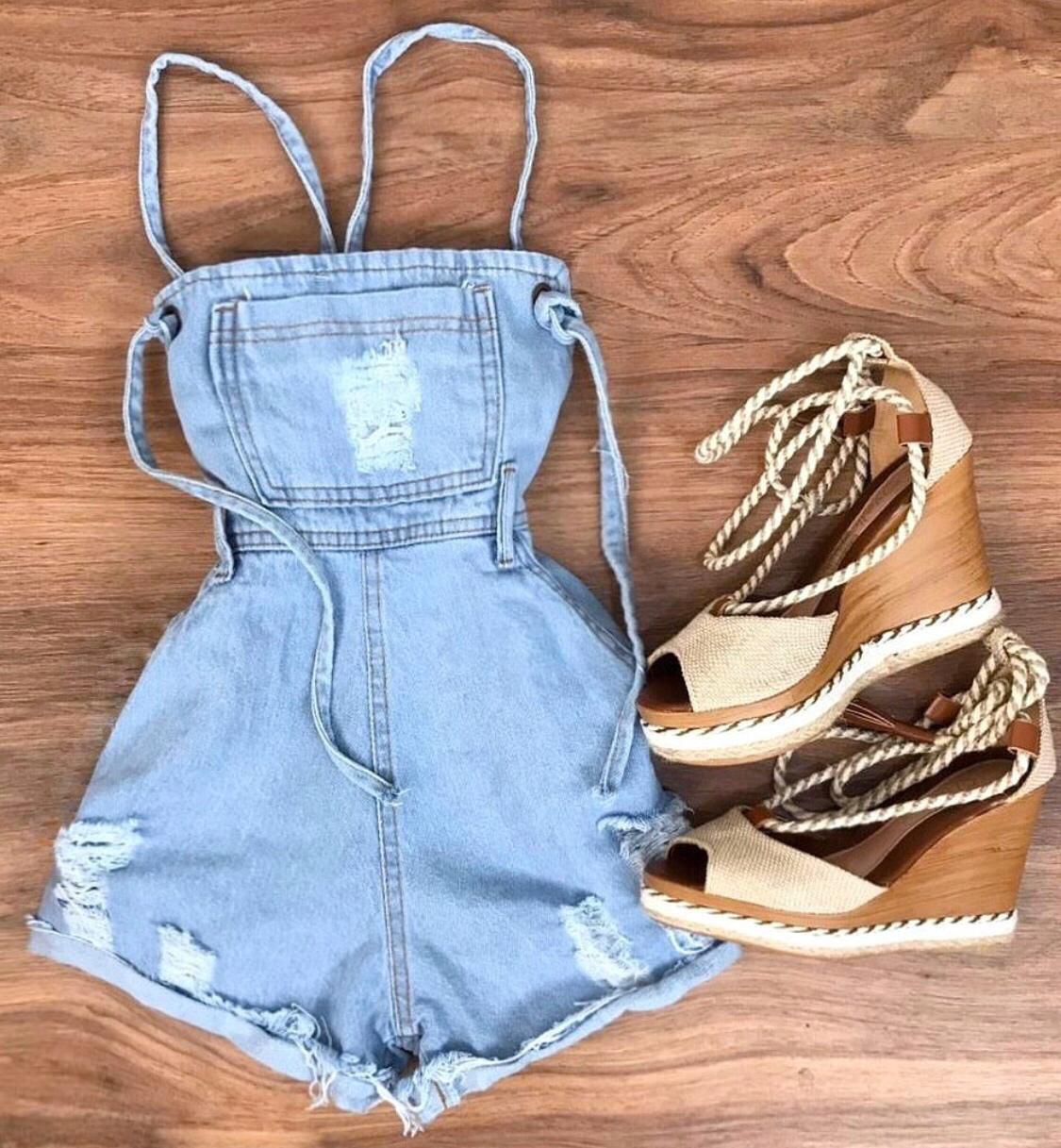 Macaquinho estilo jardineira, Jeans claro.