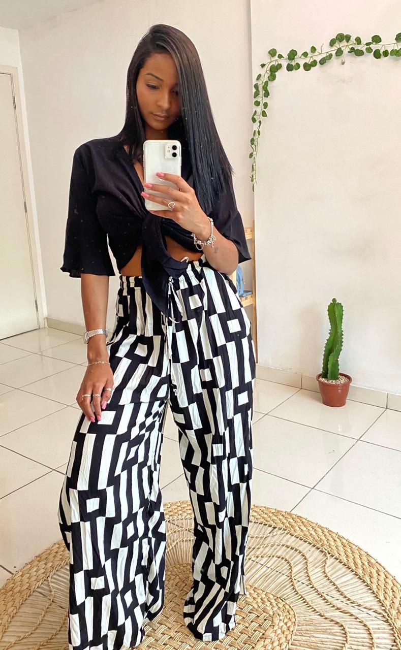 fendas nas laterais inferiores da calça, dando charme e leveza a peça.
